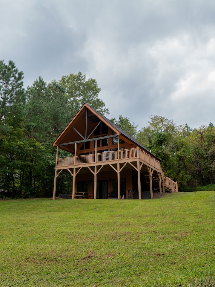 Drvena kuća na jezeru Gaston s pristaništem za brod i prostorijom za igre