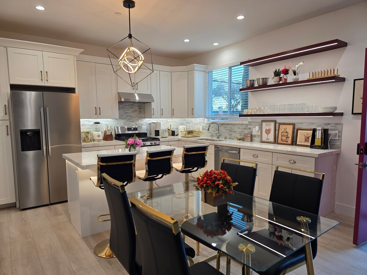 Dobro došli u svoje luksuzno utočište u Downtown Modestu! This fully remodeled 2BR/1.5BA Midcentury Modern home offers: • 107 m2 elegantnog dvokatnog smještaja s prostranim dnevnim boravkom, novom kuhinjom i kupaonicama • Veliko dvorište s travom obloženom finišerom, Edisonovim svjetlima i ognjištem • 65-inčni Smart TV, Wi-Fi od 1200 MBps, 4K sigurnosni sustav i pametna garaža • Bračni krevet (160x200) s radnim stolom i dva odvojena kreveta s vrhunskom posteljinom • do vrhunskih restorana, noćnog života i atrakcija možete doći pješice