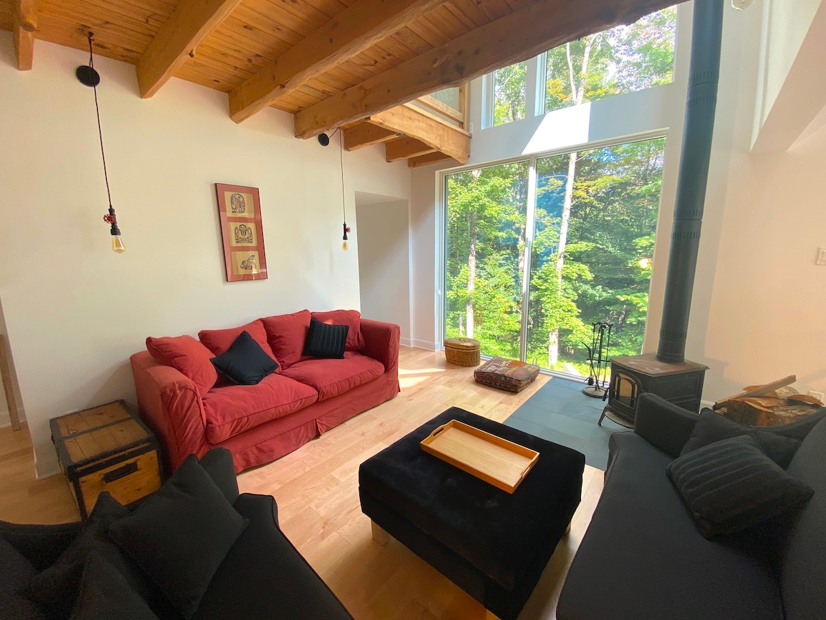 Monumental open concept, in the heart of nature. Access to trails directly behind the house. Wood stove, large modern bathroom, one bedroom + sofa bed. Another sofa bed in the living room. Ideal chalet for a couple with children or two couples. Wild birds, turkey, and deer lovers welcome! Wifi and EV charger included. Dogs Welcome! CITQ : #308038