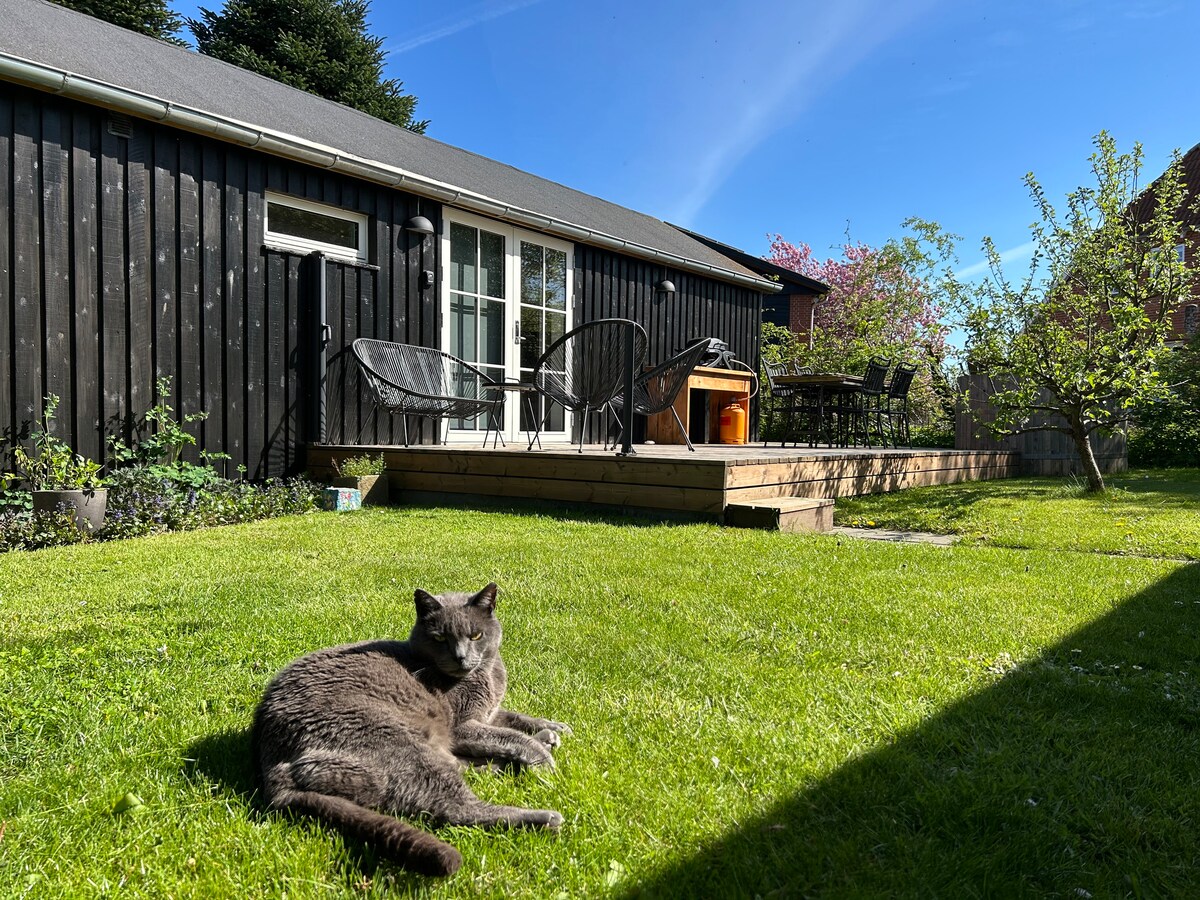 Moderna i novouređena kuća od 123 m² u mirnoj četvrti prilagođenoj djeci – idealna za obitelji, parove i poslovne putnike! Dobivate 2 udobne spavaće sobe, lijepu kupaonicu i otvorenu kuhinju/dnevni boravak sa svom potrebnom opremom. Opustite se u velikom vrtu na terasi ili ispod pergole, ili odvedite djecu na igralište ili u šetnju u šumu koja je udaljena samo 100 m. Blizu svega: 30 minuta do LEGOLANDA, LEGO Housea i Lalandije, 45 minuta do Aarhusa/Odensea, 4 km do središta grada Vejlea, 1 km do shoppinga.